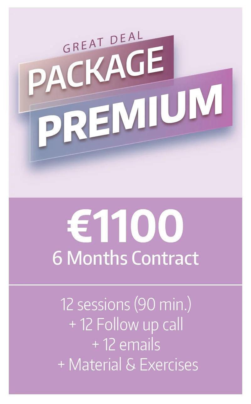 Up to twelve months commitment with Coaching Sessions conducted One-on-One or via Telephone or Zoom video conference + email support in between sessions to keep you supported and accountable + Resources to reinforce new insights and strategies to keep you aligned with yourself and moving forward in a state of flow with life.
